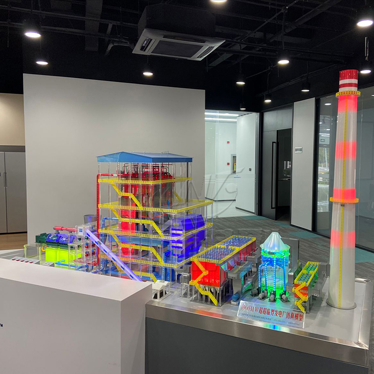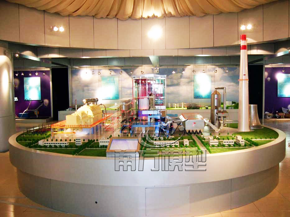 300MW火力發(fā)電廠模型主要系統(tǒng)設(shè)備由燃煤運輸系統(tǒng)、鍋爐系統(tǒng)、煙氣處理系統(tǒng)、汽輪機系統(tǒng)、發(fā)電機系統(tǒng)與電氣系統(tǒng)等組成,按300MW熱電廠運行的300MW火力發(fā)電機組圖紙縮比制作,300MW燃煤電廠模型包括:鍋爐、汽機、制粉、除塵、脫硫、脫銷、煙囪、升壓站等幾大部分。將電廠的汽、水、風(fēng)、粉、電幾大系統(tǒng)的設(shè)備,管道以及設(shè)施等按照實際場景寫實制作。各系統(tǒng)不同的設(shè)備、管道等分別用實物配色展示,主要設(shè)備間用燈光顯示,工質(zhì)流動方向用箭頭指示。各系統(tǒng)的管道用不同顏色的PMMA材質(zhì)制作,原理準(zhǔn)確,結(jié)構(gòu)清晰。汽機機廠房透明或過半剖視,詳細(xì)展示系統(tǒng)運行狀態(tài)與模擬汽機運行。輸煤系統(tǒng)部分由輸煤火車、斗輪機、翻車機從煤倉斜向上皮帶運輸機將翻車機、 斗輪機的煤運送到下一工段,輸煤皮帶將煤運送到各個煤粉倉后進入磨煤機。
